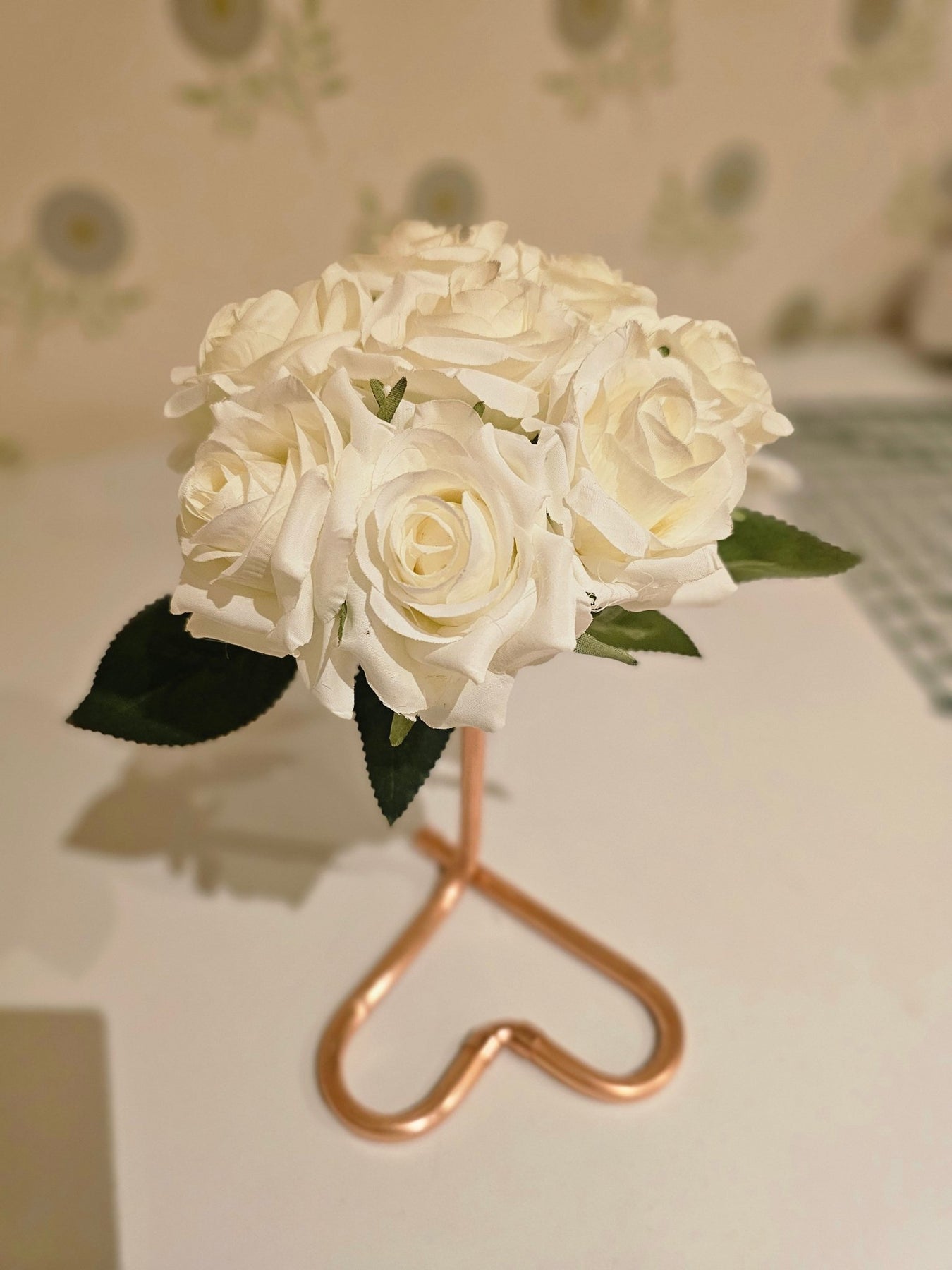 The Ivory Rose Bouquet features meticulously crafted artificial roses, providing a lasting aesthetic appeal without the need for maintenance. Accompanied by a copper pocket stand, this arrangement offers versatile display options. Ideal for decor, it adds a touch of elegance to any space while ensuring durability and longevity.